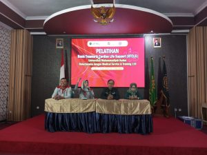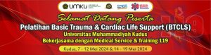 pembukaan simbolik di ruang serbaguna kampus 1 umku, dihadiri oleh wakil rektor 1 bapak sukarmin, M.Kep.Ns.Sp.Kep.MB,Dekan fikes ibu indanah, M.Kep.Ns.Sp.Kep.An,dari MST 119 bapak eko pery dan ibu yuli. bapak warek 1 berpesan untuk bisa menikmati pelatihan BTCLS dengan senang dan merasa memilliki UMKU