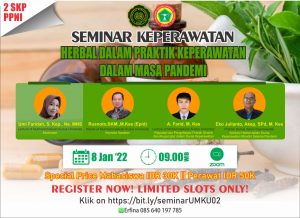 seminar nasional yang di selenggarakan oleh kelas rsud kudus dengan tema besar terapi komplementer .seminar di laksanakan tgl 08 januari 2022 jam 09.00. acara dibuka oleh rektor umku bapak rusnoto, SKM.,M.Kes(Epid). acara inti di isi oleh pakar komplementer oleh bapak Farid.,M.Kes ddari umku dan bapak eko julianto, A.Kep,SPd.,M.Kes praktisi herbal dalam keperawatan. moderator kegiatan ini ibu umi faridah, MNS dosen umku dan sekaligus kaprodi s 1 keperawatan di umku. peserta kurang lebih 120. harapannya perawat bisa praktik mandiri sesuai undang – undang perawat dan berasarkan ilmu keperawatan florence nightingale. dengan semangat perawat yang bisa praktik mandiri harapannya kesehatan masyarakat meningkat ddan mandiri